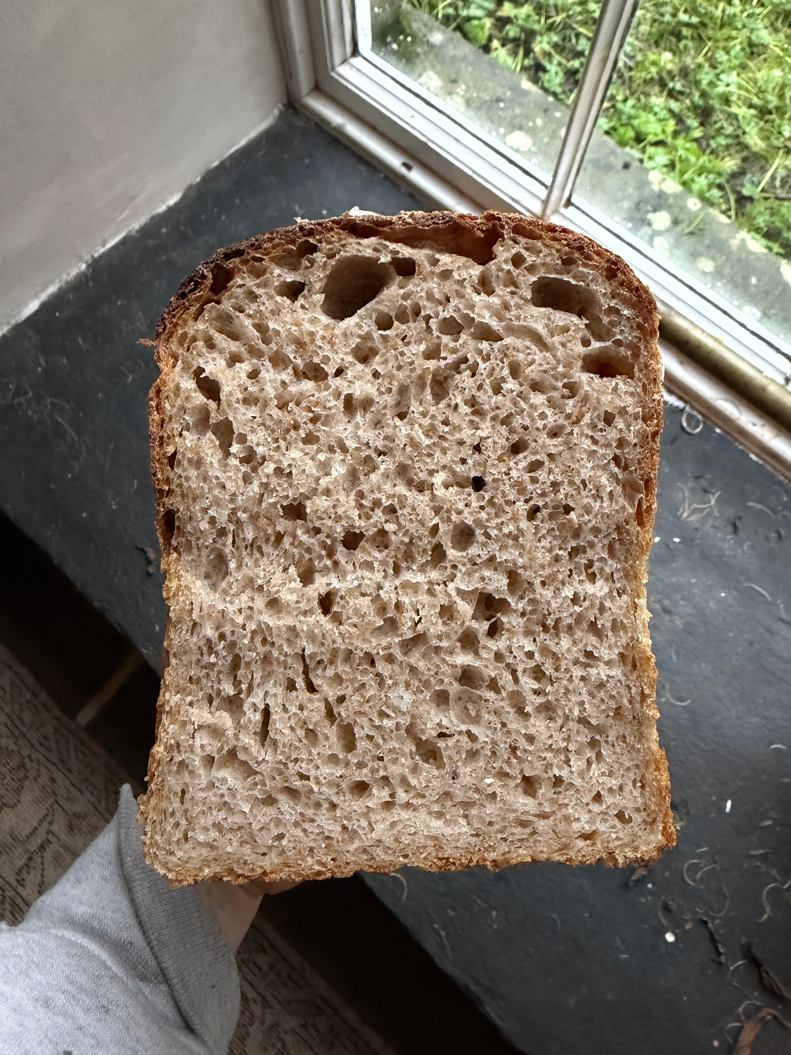 This is today’s bread made with organic flour from Angus’ farm fermented over 4 hours with three folds, you can see the texture of the crumb is far more even.