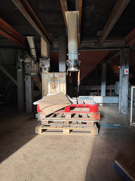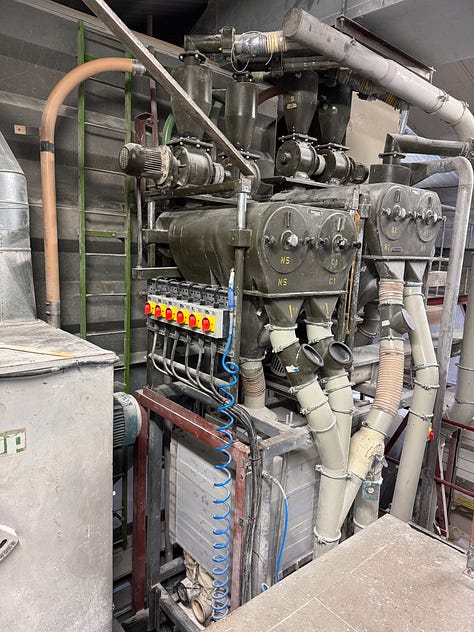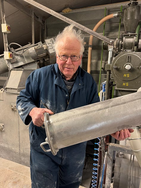 Angus runs a roller mill, his mill is a rescue from the Swiss army and this year it will be fifty years old. This is not a fancy mill, there has been plenty of tinkering along the way to get it working as they need. In the picture above Angus is holding one of the meshes that the flour is blown through as part of the milling process, the finest they used to be able to make them was a 0.6mm metal mesh so the flour was a lot coarser, when this mill was built that was the best available. They now have fine nylon meshes which go down to 125microns meaning the flour we get today is a lot softer and finer to the touch. Out of 1 ton of grain Angus will be able to mill 700kg of flour, whereas flour you would typically buy from a supermarket will yield around 850kg, meaning you are getting a product with more of the wheat sheath included. It also goes part of the way to explain how there can be such a variation of price within a bag of flour. The years of preparation which goes into the soil before the crop can even be sown, followed by the yield loss through the milling process, you start to understand how mills like Angus struggle to keep afloat.